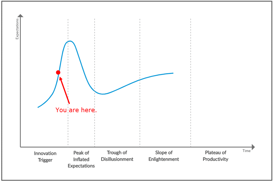 In my opinion, we’re currently scaling the upward slope of inflated expectations. All the symptoms of hype are present, including the following:
