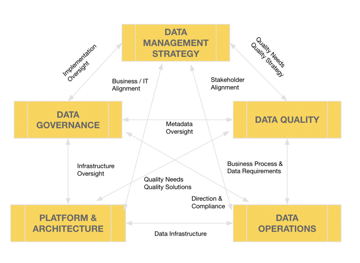 For a fuller process to guide your data lake project, a very suitable companion to Gorelix’s book are the six key themes of CMMI’s Data Management Maturity (DMM) model. This framework provides a Fortune 500 tested (and even NASA tested) methodology for IT and data management teams to work from when planning a large scale project like a data lake. Here is what the relationship between the six data management themes of the DMM model look like: