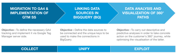 As you’ll see, getting a 360 view of your customers depends on three pillars: collection, unification and exploitation. This is convenient, since these are precisely the technological advantages offered by GA4, BigQuery and GTM SS. As the saying goes, nature knows best (or in this case, Google). 😉