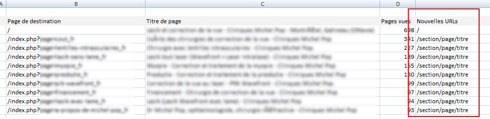Use Google Analytics to identify which pages are generating the most traffic. Say, the top 100 if your site has hundreds of pages. Export this list to an Excel file and be sure to include data to identify the content of the page targeted by the URL. Why give a hint about the content targeted by the URL? Let's assume that your URLs do not contain any keywords, but only arguments of the type id=22. Even if you make a great list of URLs, you won't be able to associate old URLs with new ones since you won't have any idea what your URLs are about. So much the better if you have clean and descriptive URLs, because it will be easier to make the associations. But if not, the page title gives a great clue about the content of the pages targeted by your URLs.