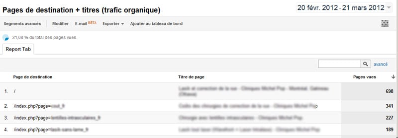 Sound complicated? It is enough to do it once to find that it is simple. Unfortunately, the new version of Google Analytics does not offer the possibility of displaying landing pages and page titles in one step. It is therefore necessary to design a personalized report. The work of association may seem long and tedious, but it will prevent you from losing precious visits, but above all to preserve a hard-earned SEO over time.