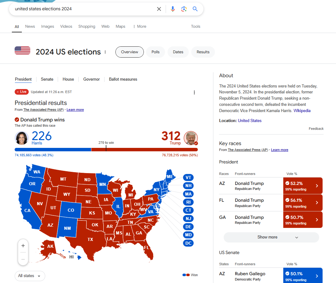 Google has been around for many years. During all of that time, one of its main focuses has been to improve user experience. For this reason it’s more enjoyable to do a search on the American elections on Google 👇