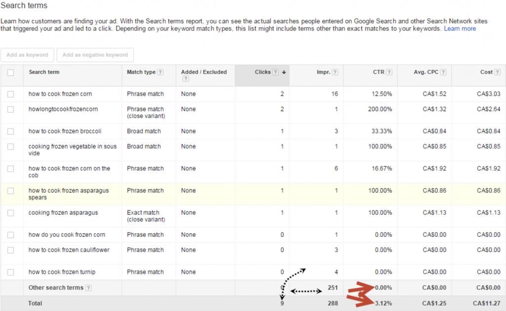 I direct your attention to the last line of the report, it is very often ignored. And yet so important! The “Other search terms” line here contains 87% of impressions and 0% of clicks, so it is a banner that hides the most useful information for your optimization, namely: What are the less interesting queries that my targeting currently covers? . Until now, the only solution used is to manually add interesting targeting in exact and thus slowly get rid of these less attractive impressions.