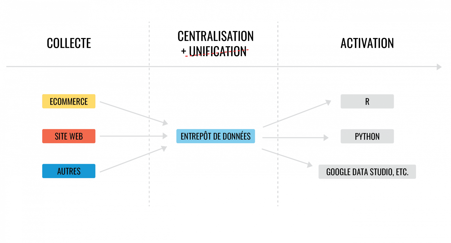 Still, two important aspects are generally not included with data warehouses, namely the unification and activation layers. In other words, once you’ve centralized your data in a warehouse, you would need a data scientist to unify all the different data sources (easier said than done) and to activate the data as a media audience, for example.