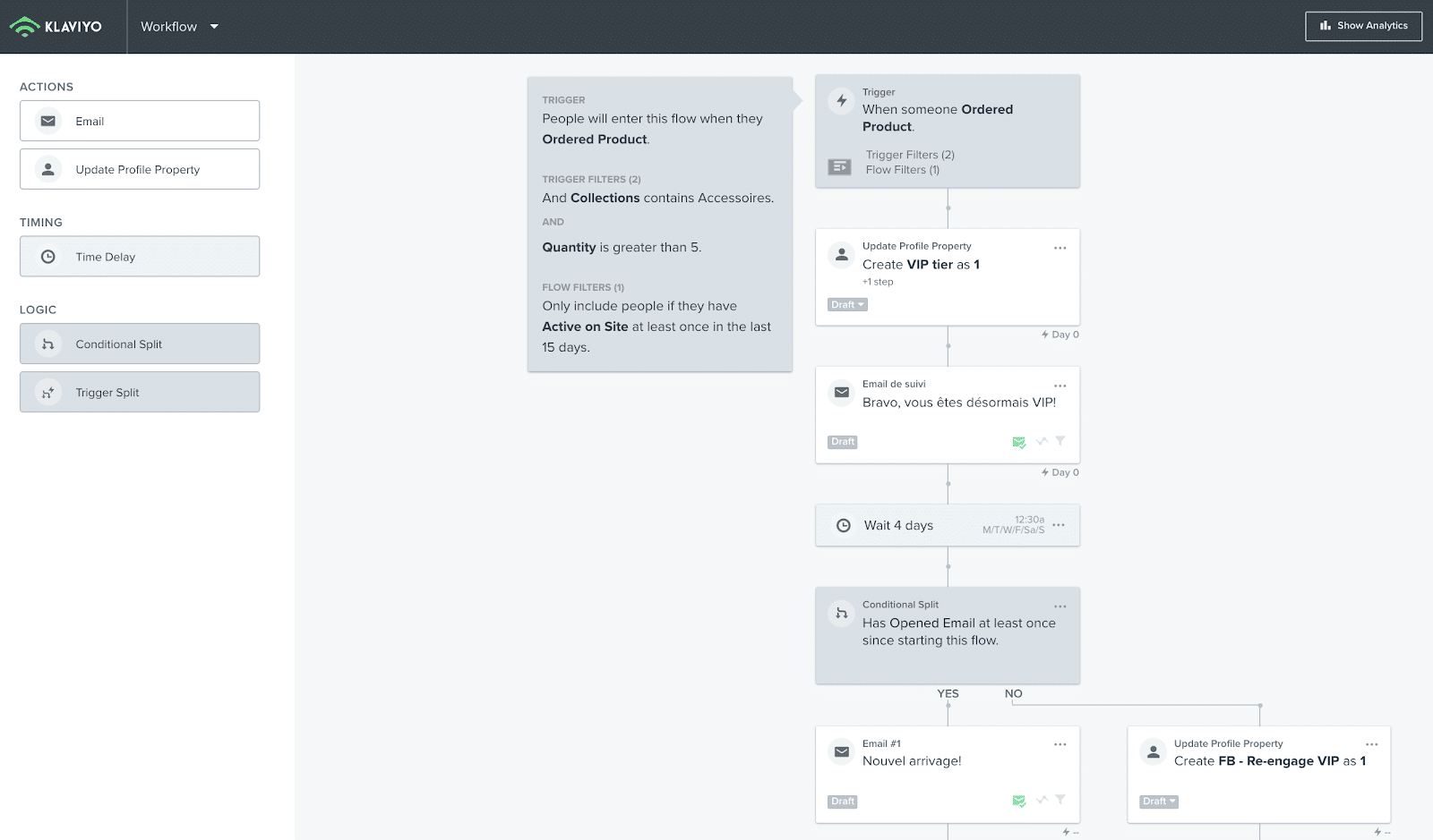 As an example, let’s look at an automation trigger based on a purchase or purchase pattern. The image below demonstrates an e-commerce trigger for accessory purchasers who recently visited the website. Once the criteria are met, the user is identified as a tier = 1 VIP (arbitrary rule, you can make it anything you want). The user is then sent an initial email. If they open it, a follow-up is sent with recommended products. If they don’t open it, they are added to a Facebook audience specific to VIP clients.