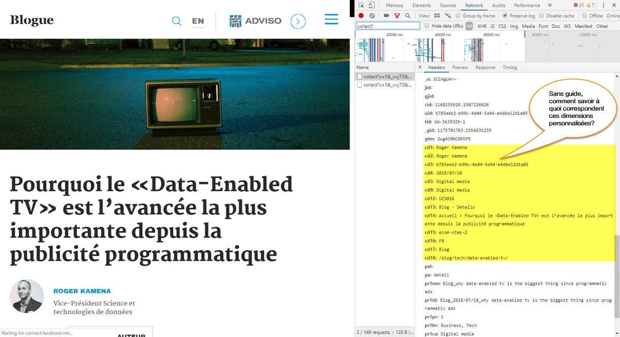 – The elements that aren’t present by default in your tool, like Google Analytics personalized dimensions, conversion variables or Adobe Analytics events