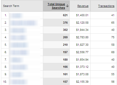 When you activate the Google Analytics search site , you enter Ali Baba's cave because the information found there is highly relevant and even strategic. The volume of keywords searched, their long tail and the revenue associated with them tells you which products are important to YOUR customers. A rigorous and periodic analysis of these results can influence the ergonomics of your site and the promotion of certain products. In fact, you have access to a low-cost behavioral study that can dramatically change your online offering.