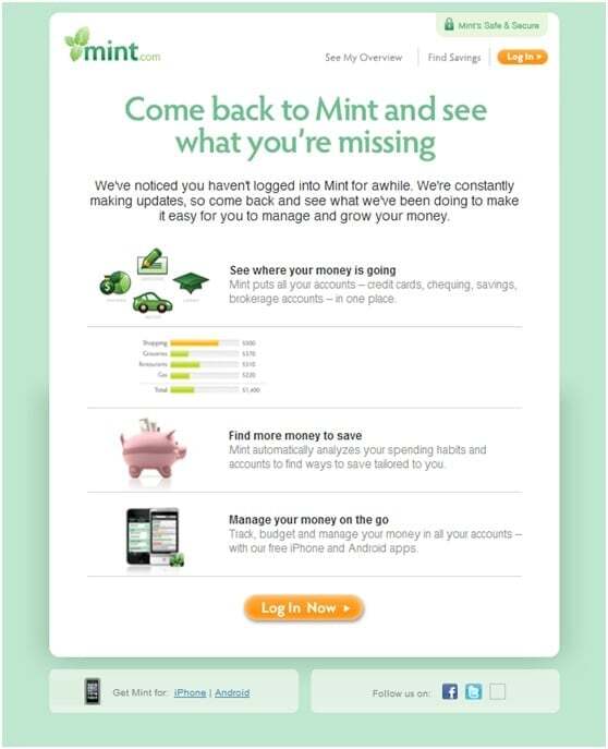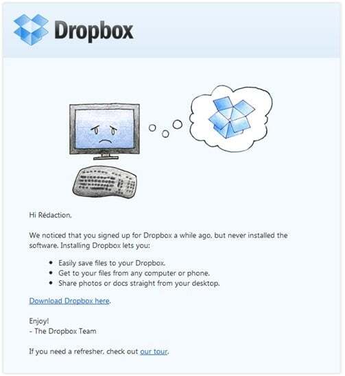 A site inactivity email is a great way to pick up a once active user and remind them to come back to your site. Dropbox and Mint.com do this very well. This email shows your customer that you are listening to their needs. You can take the opportunity to tell him about new features since the last time the user logged into his user account.