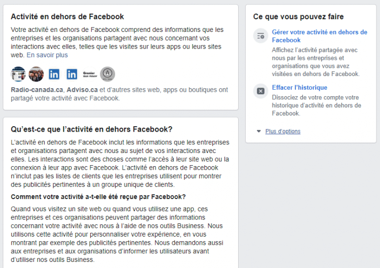 Clicking View takes me to the next page explaining what off-Facebook activity is. After a quick read (because between you and me, I especially want to know who has access to my data), all I need is a click on Manage your activity outside of Facebook to get to the end of my quest! I'm starting to be from Terrebonne-Humeur (continuation and end of the wink.)