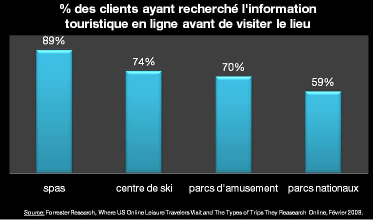Indeed, 89% of the clientele of spas and health centers in the United States would have sought their information online, which is significant! Next come ski resorts (74%), amusement parks (70%) and national parks (59%).