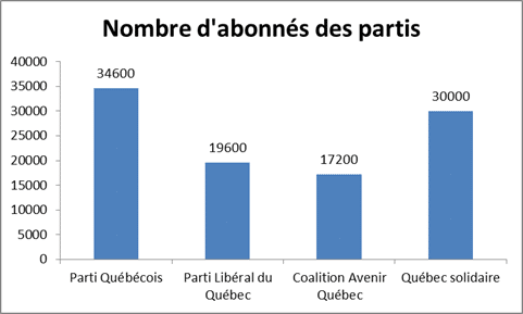 If we look at the Twitter accounts of the parties running in the 2014 Quebec elections, the one with the most subscribers is the Parti Québécois with 34,600 subscribers as of March 23, 2014.
