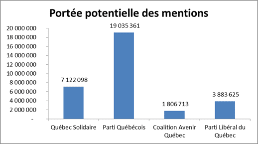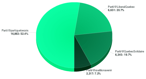 We note that the Parti Québécois is the Twitter account that had the greatest visibility during the period analyzed, i.e. 19,035,361 Twitter users who could have seen the Twitter account.