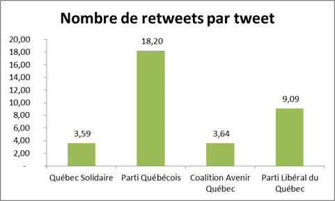 The number of retweets, although the analysis covered 2 weeks instead of 1 in the 2012 analysis , increased greatly, from 1161 to 5643 for the Parti Québécois. The same goes for the average number of retweets per message, which rose from 4.35 to 18.20 for the Parti Québécois.