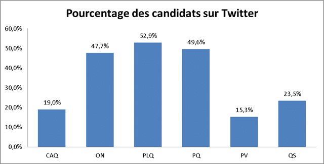 The party with the highest rate of candidates on Twitter is the PLQ, of which 52.9% of candidates have a Twitter account. Here is the rate of use of Twitter by the parties: