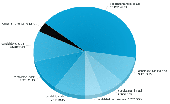 The most popular candidate on Twitter is Amir Khadir of the QS party with over 27,517 followers. Here are the top 10 candidates with the most followers on Twitter. The digit to the right of the party corresponds to the Klout score . We note that the highest Klout score is François Legault with 69.