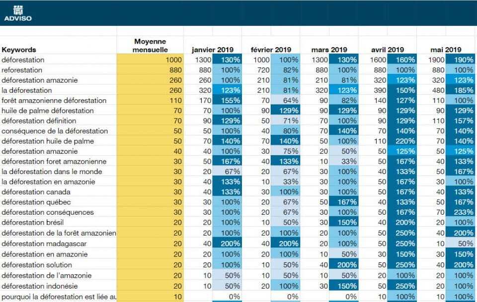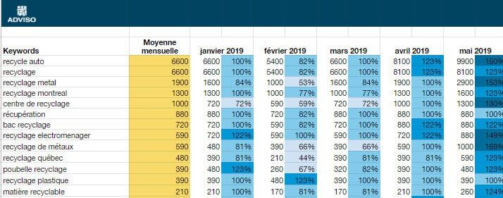 Secondly, this tool also makes it possible to analyze each theme in more depth by comparing the levels of popularity of the associated queries, again according to the month. The darker the color, the more the keywords are searched for relative to their annual search average (meaning good seasonality).