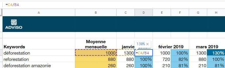 4 – Then enter a simple formula in the columns to the right of the months to reflect the proportion of monthly volumes compared to the annual average and voila! Adding a color ruler will visually identify content opportunities for each month.