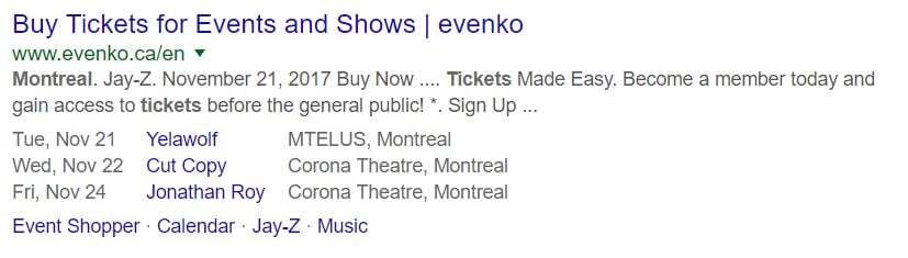 Aggregation of number of reviews, date, location and event name. Google may also display site links, as is the case here.