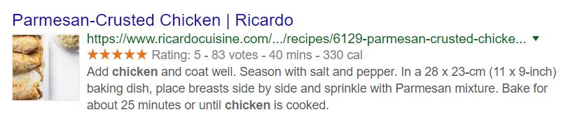 A rich snippet is a search result that’s been enhanced with additional information beyond the title, URL and meta description. There are several types, and you’ll find the most popular usages below. The supplemental information presented with the search result varies depending on the type of content, and is retrieved using structured data. Multiple structured data formats exist (JSON-LD, Microdata, RDFa). For technical details, you can refer to Google’s support guide.