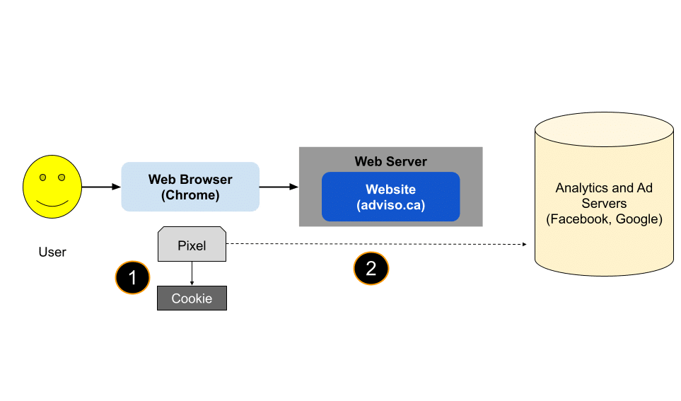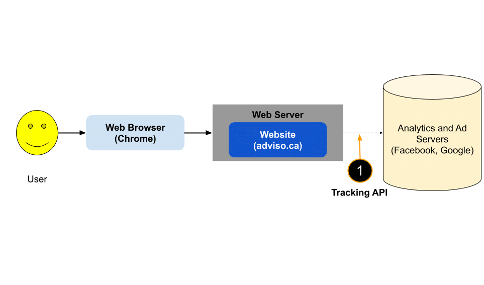 Typical analytics and marketing tracking implementations are done using a pixel (a piece of code). The pixel is installed on the website. Once a user enters the website, in this example for the first time, this pixel is loaded in the web browser of the user. The pixel will set a web cookie (point 1 on the graph below) in the user’s browser, where an anonymous ID will be stored to identify the user during their interactions with the website (browsing pages or clicking links). Every time the user interacts with the website, the pixel will send an event to the analytics/ad servers and attach the anonymous ID stored within the web cookie (point 2 of the graph below). This anonymous ID will allow the vendor (Google, Facebook, etc.) to link these events to a user. The graph below illustrates the process. We will call this process client-side tracking (from your browser to the vendor’s analytics server).