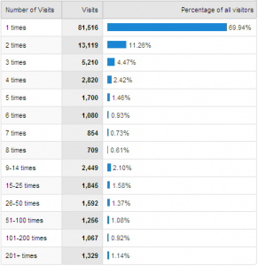 Frequency is a loyalty indicator that calculates the number of visits made by a unique visitor over a given period. The frequency of visits depends a lot on the frequency of updates of your content as well as the volume of content produced. The target to be reached should be essentially based on the number of articles produced over a given period.