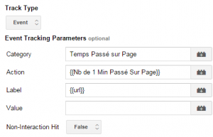 11) Under the Event Tracking Parameters section, enter "Time spent on page" under Category (you can name the category something else), and the name of the macro created in step 7 (in our example it would be "NB of 1 min passed on page”) under Action. The Label and Value boxes are optional, you can leave it empty if you prefer.