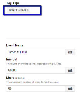 3) In the "Interval" box, enter "60000" (60,000 milliseconds = 1 minute) and in the "Limit" box, enter "60" to limit the execution of this tag to 1 hour (60 min).