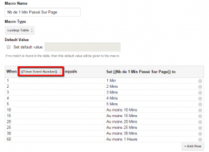 7) Create a second new macro of the "Lookup Table" type to translate the number of times the Timer Listener is triggered by GTM, so that the report of this event in GA is more comprehensive. It should look like the image below; notice that the macro created in step 6 is framed in red. Don't forget to click “Save”.