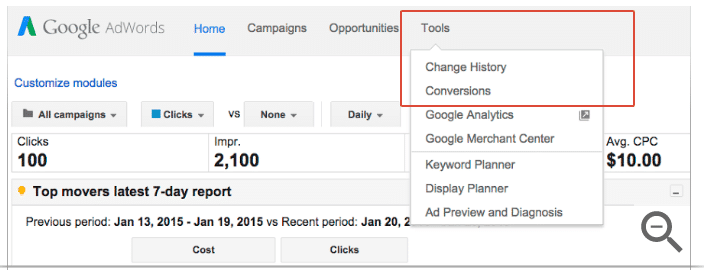- To set up a new conversion action, simply go to “Tools” then click “Conversions”