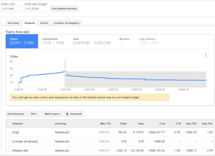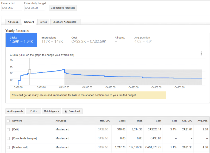To start off, you must go into the Keyword Planner and insert all your possible keywords and simulate results. You will discover that for a set bid and a daily budget, Google will point out the maximum clicks per day you could get, before reaching a decline point. This is the grey area in the above caption.