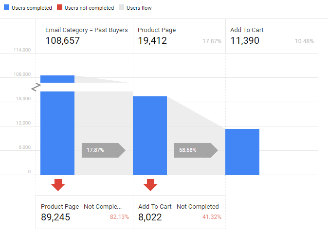 - For those of you lucky enough to have Google Analytics 360 (formerly GA Premium), you can use one of my favorite features: Custom Funnels. Let me explain the one I created below. Essentially, this tool allows you to see which users have already purchased, who have already visited a page on your site, who have visited a particular product and who have finally added the product to their cart. It also tells me how many users have abandoned the funnel. I could also have added the checkout and purchase confirmation steps if I wanted to. It's important to know that "Past Buyers" is a segment imported from ExactTarget (or CRM), and this conversion funnel sheds light on how these convert. Of course, you can create a similar funnel with other ExactTarget segments/fields and different stages. And that, my friends, is what I call analytical web marketing 🙂