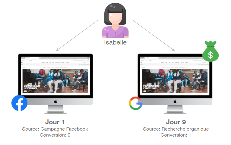 Let's take an example: Isabelle arrives on the site www.monsite.com from a Facebook ad, browses a bit, then leaves the site. She returns there nine days later in organic search to finally make a purchase there.