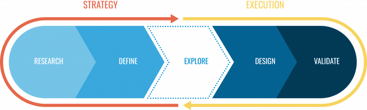 Looking beyond internal issues, our vision is focused on the end-user to ensure they have a frustration-free digital experience. That’s why it’s essential to follow a specific methodology from strategy to execution, divided into five steps: research, define, explore, design, validate.