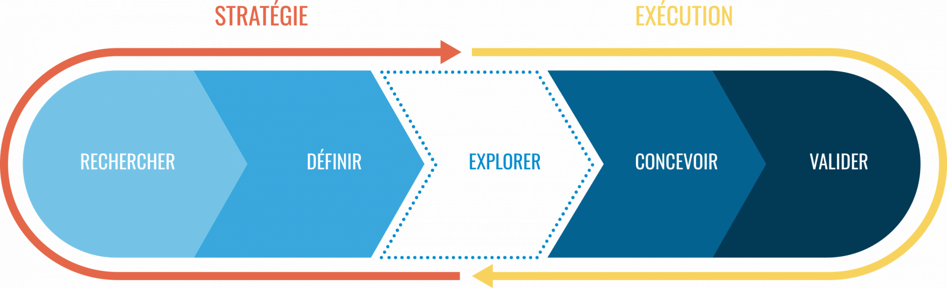 Au-delà des enjeux internes, notre vision est tournée vers l’utilisateur final pour lui offrir une expérience numérique sans frustration. Il est donc primordial de suivre une méthodologie précise de la stratégie à l’exécution, divisée en 5 étapes: rechercher, définir, explorer, concevoir, valider.